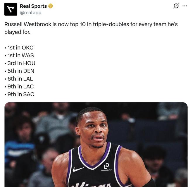同时本场作为国王再次拿下3双后,威少在国王队史三双榜单排名上升至第9,这让威少又迎来一项神迹,即生涯至今在效力的7支球队中三双数均杀入队史前十。